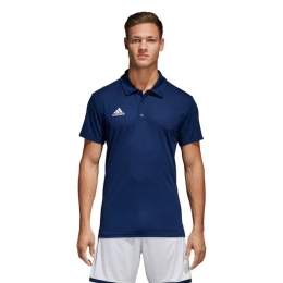 Męska koszulka adidas CORE18 POLO to koszulka z krótkim rękawkiem. Koszulka ta została zaprojektowana z myślą o osobach aktywnych fizycznie, w szczególności piłkarzach. Koszulka posiada kołnierz w stylu polo, z zapięciem na trzy guziki. Koszulka zbudowana została z tkaniny climalite®. Jest to tkanina w 100% syntetyczna, wchłania pot z powierzchni skóry i odprowadza go do jej zewnętrznej warstwy, aby szybciej wyparował. Utrzymuje ciało suche, dając uczucie komfortu. Zabezpiecza ciało przed przegrzaniem w wysokich temperaturach, umożliwiając ciału utrzymanie stałej temperatury, dla poprawy wyników sportowych. Obniża prawdopodobieństwo przeziębienia się po ćwiczeniu. Krój koszulki jest swobodny. Koszulka została wyposażona w dodatkowy, zapasowy guzik, który został przyszyty do metki. Na prawej piersi umieszczono kontrastowe logo adidas, w kolorze białym, natomiast po lewej stronie, u dołu koszulki umieszczono także biały napis climalite.