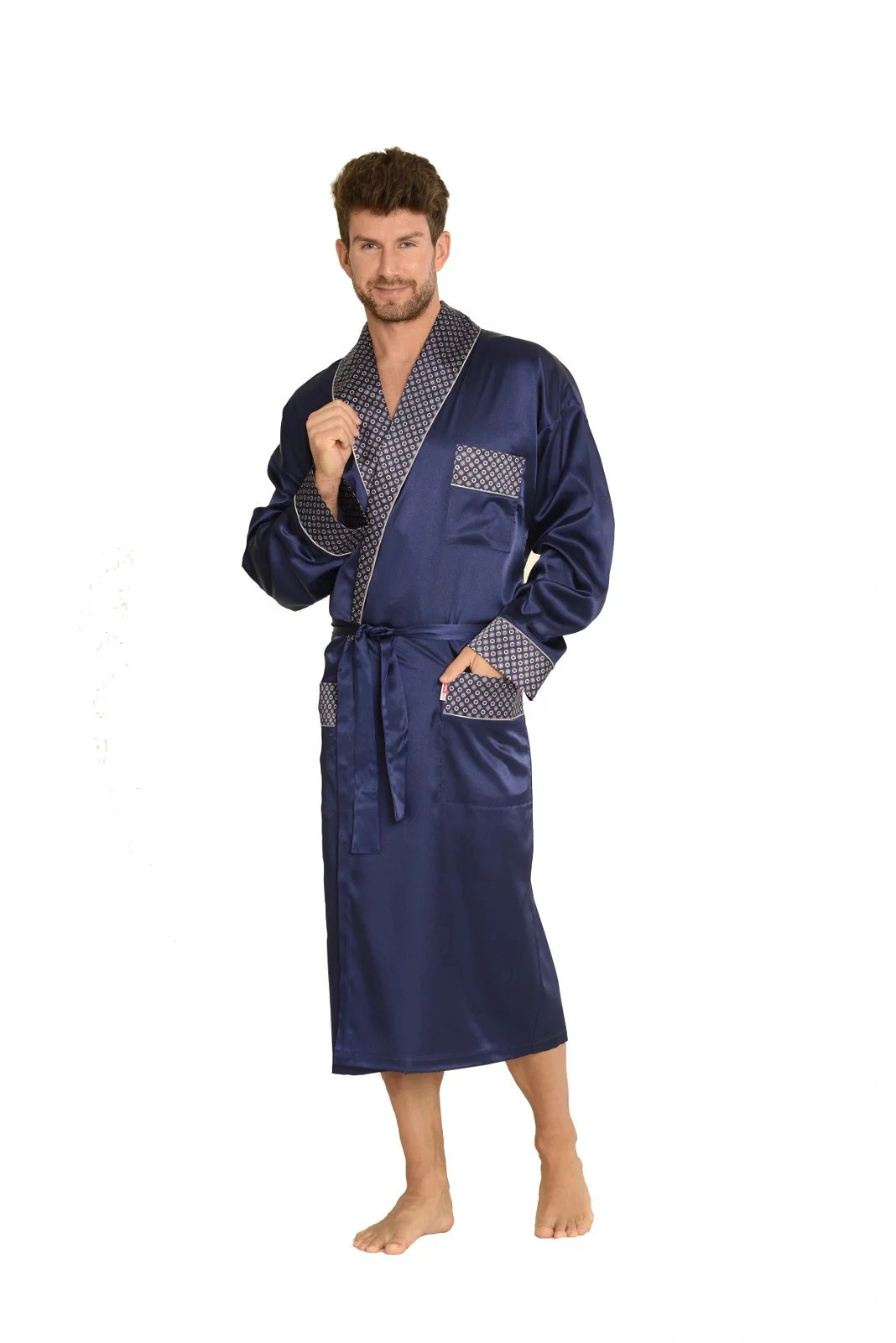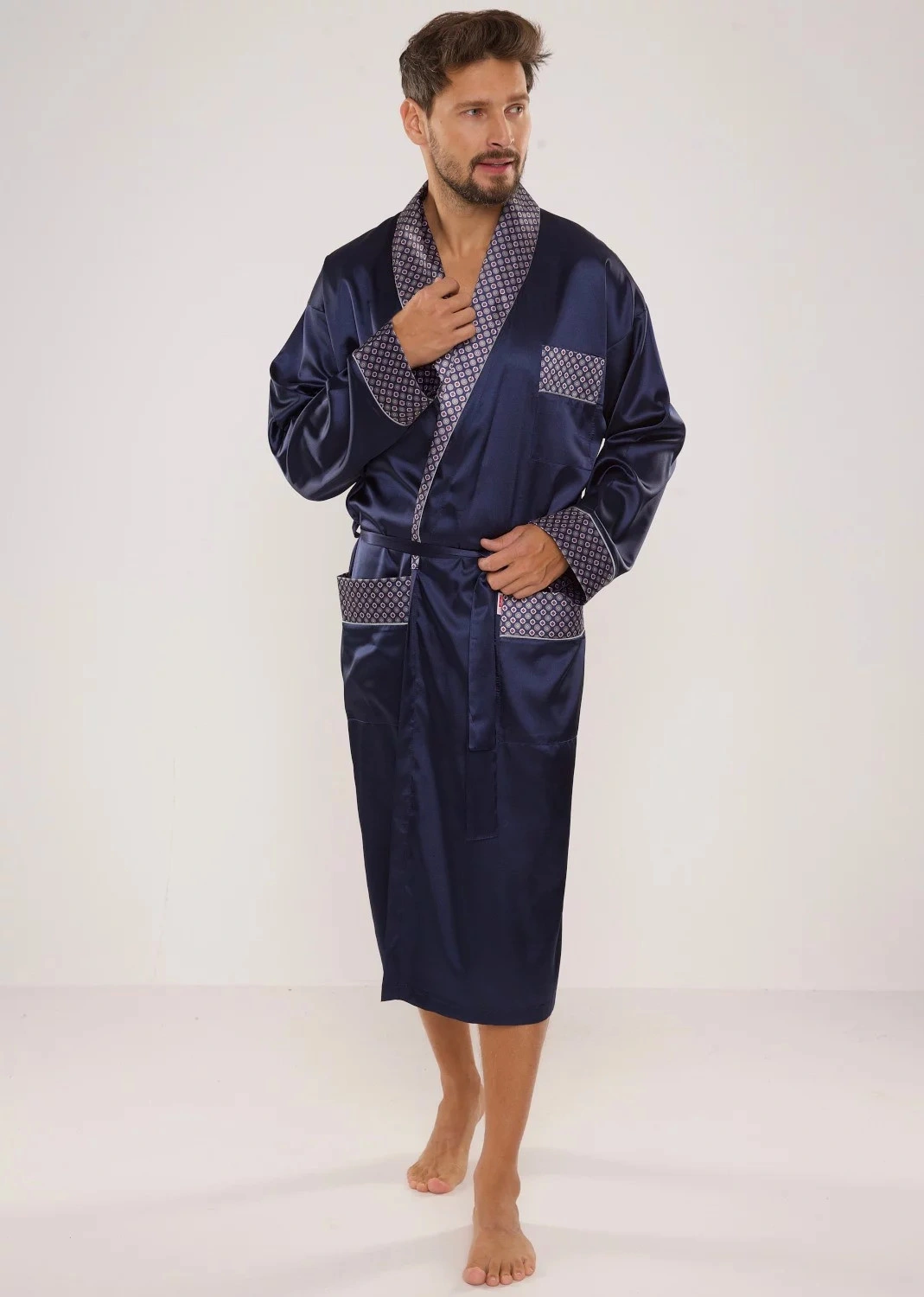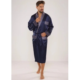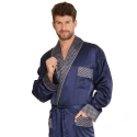 Župan je dlhý, má šálový golier a zaväzuje sa v páse. Na úrovni bokov má dve vrecká. Manžety, golier a vrecká sú olemované vzorovaným materiálom.