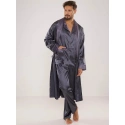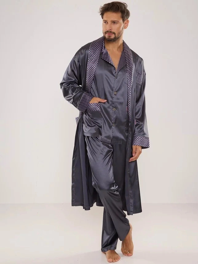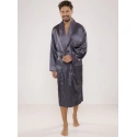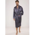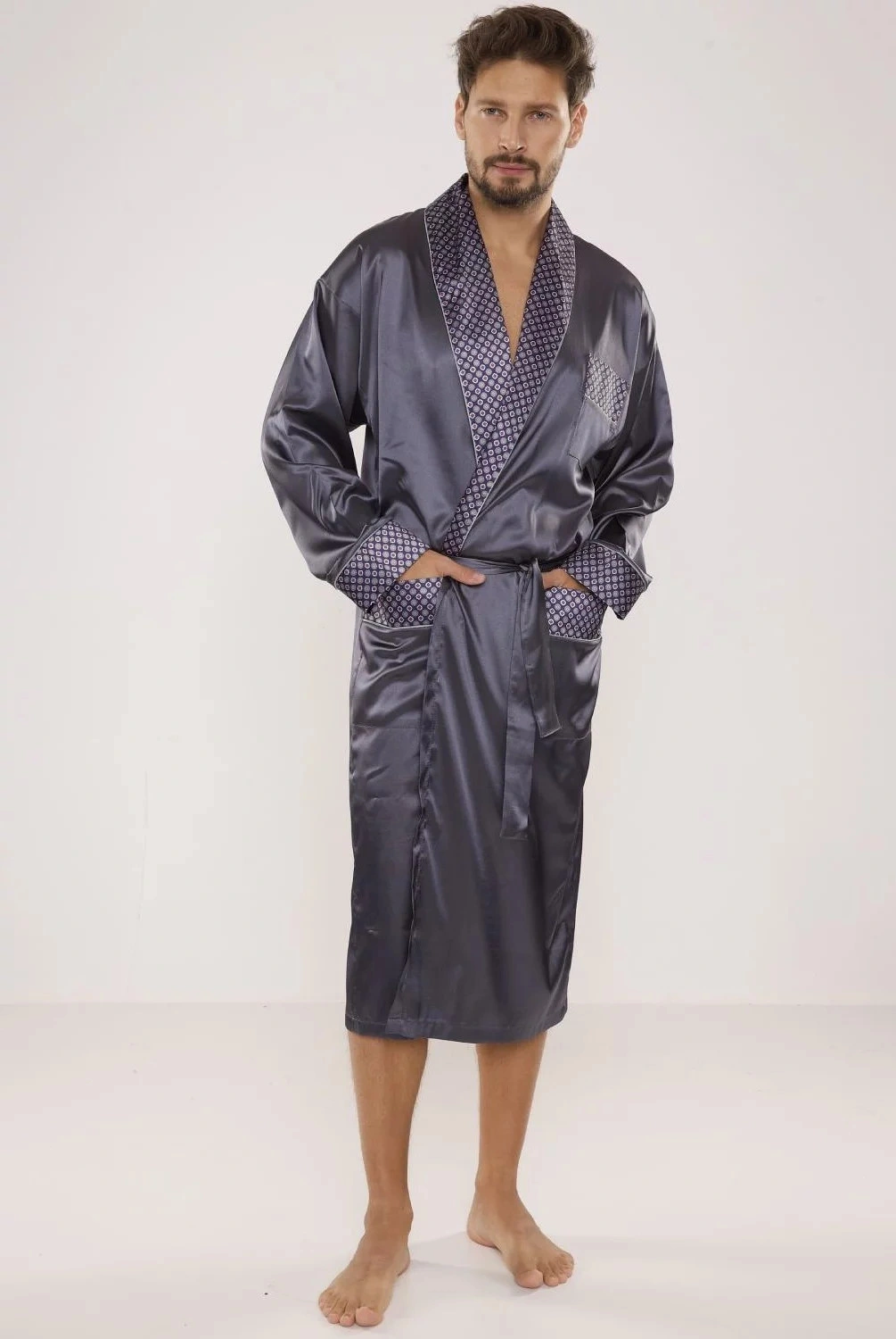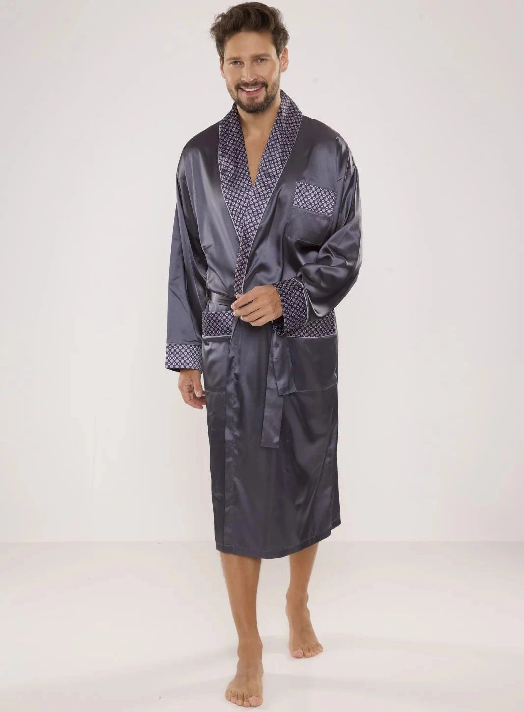 Župan je dlhý, má šálový golier a zaväzuje sa v páse. Na úrovni bokov má dve vrecká. Manžety, golier a vrecká sú olemované vzorovaným materiálom.