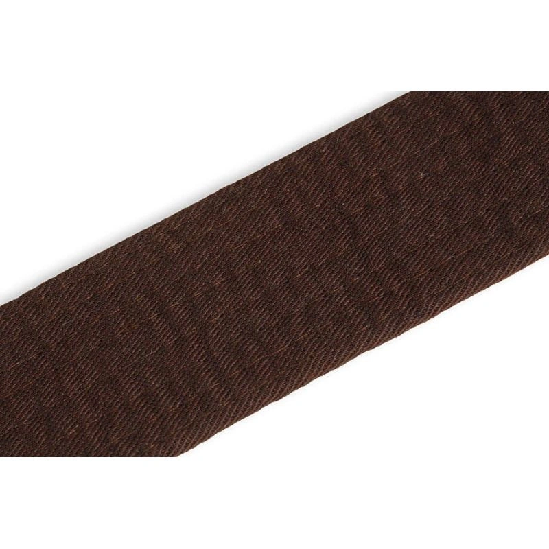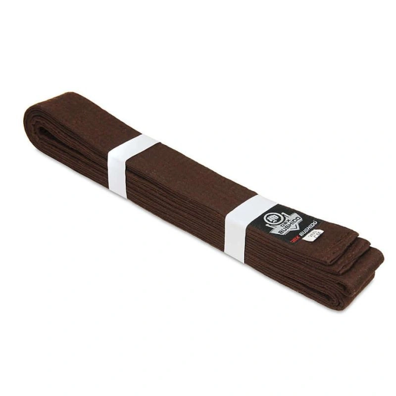 Hnedý opasok na kimono používaný v bojových umeniach vyrobený z materiálu, ktorý je zmesou polyesteru a bavlny pre odolnosť proti oderu a roztrhnutiu.