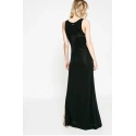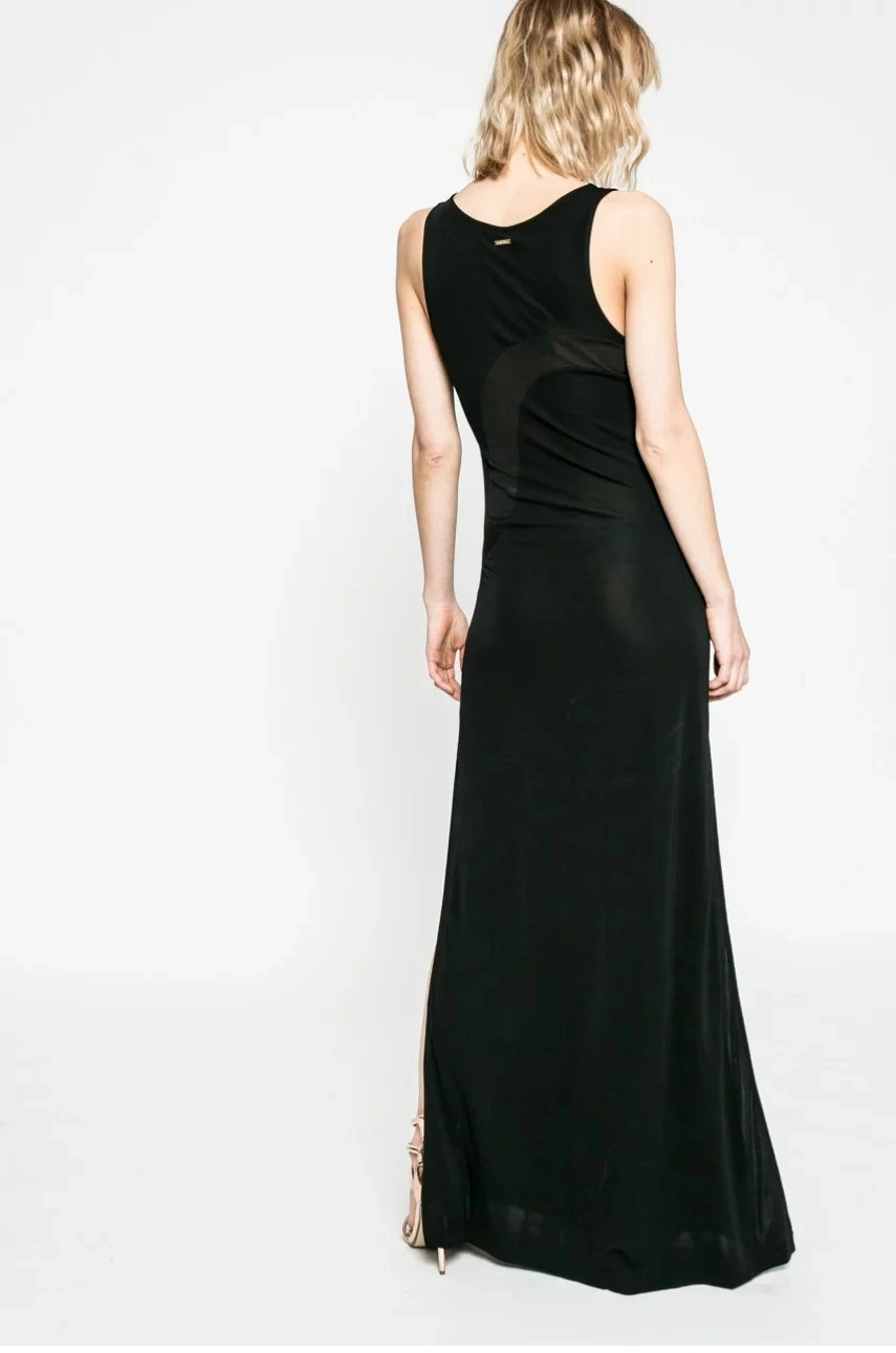 Čierne dlhé zmyselné šaty bez rukávov, zaväzované na ramenách, s veľkým hlbokým výstrihom. Horná čas