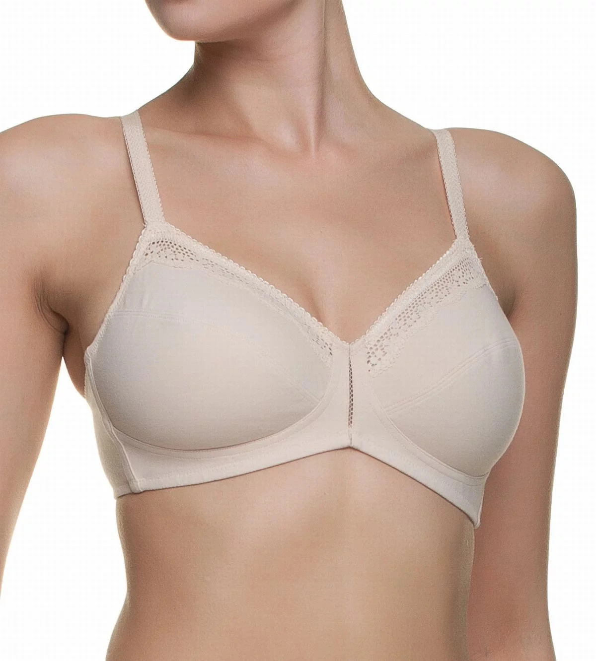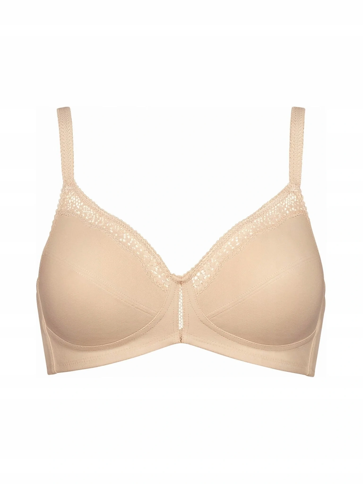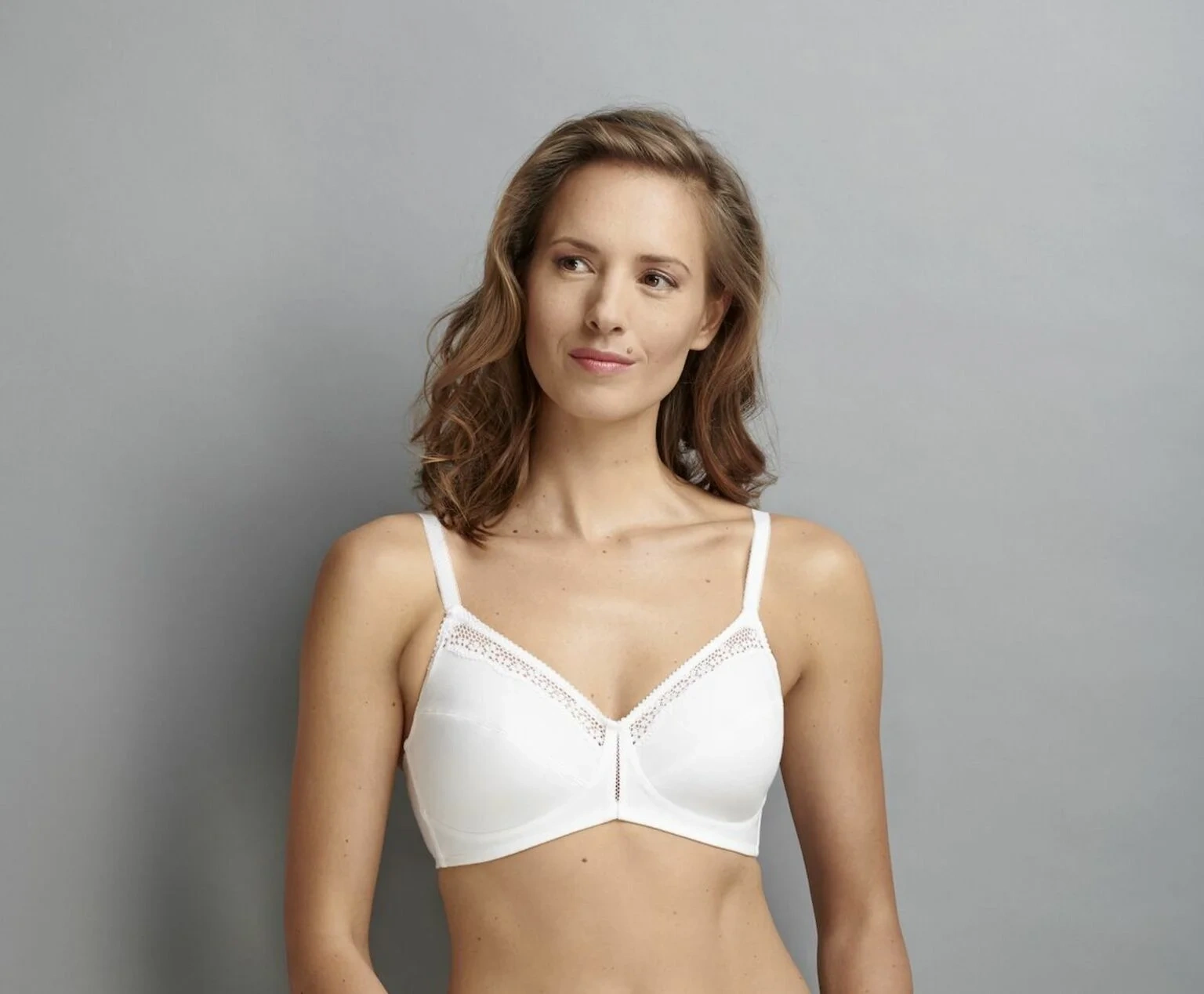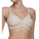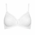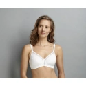 Navyztužená podprsenka bez kostíc z príjemného materiálu, vo výstrihu zdobené košíčky všitou jemnou čipkou.