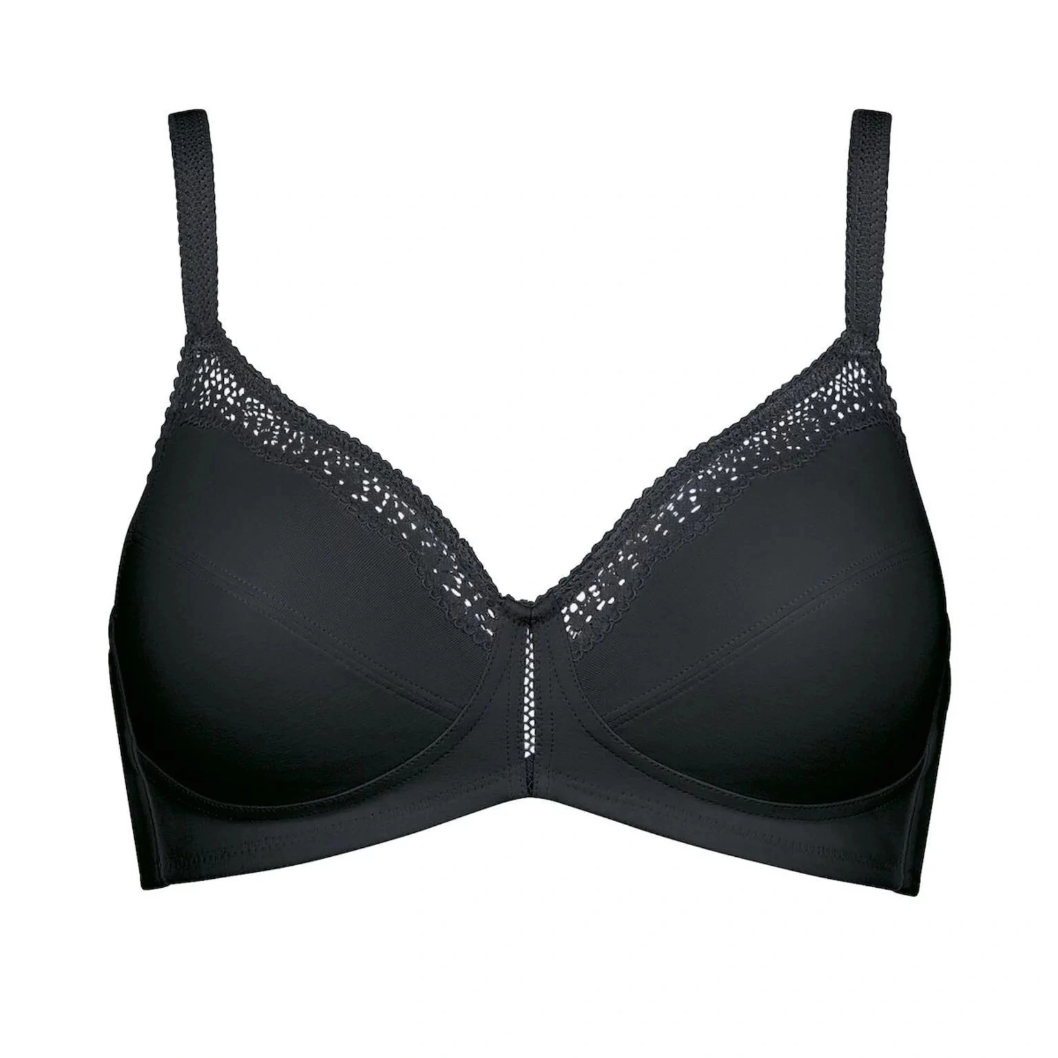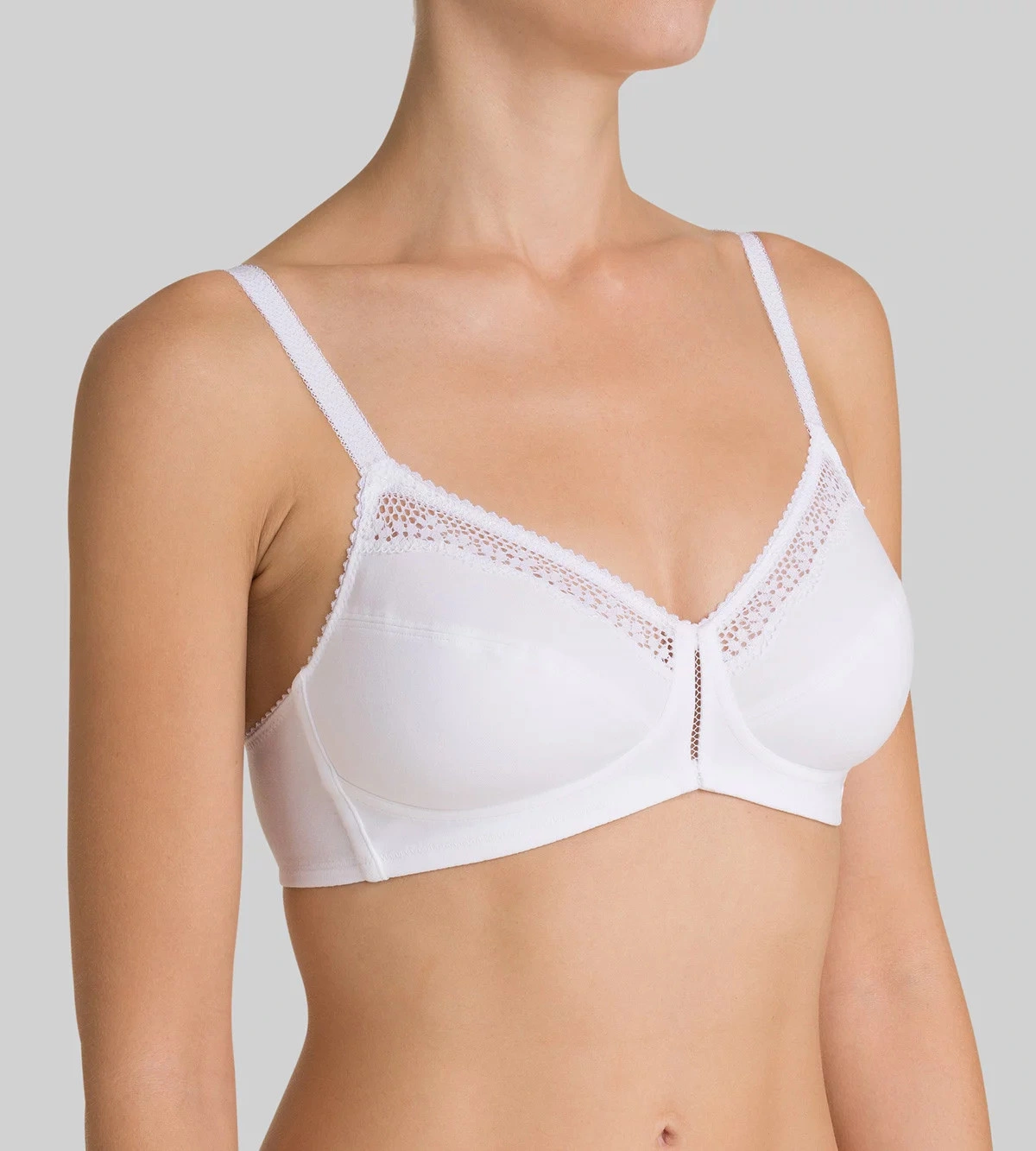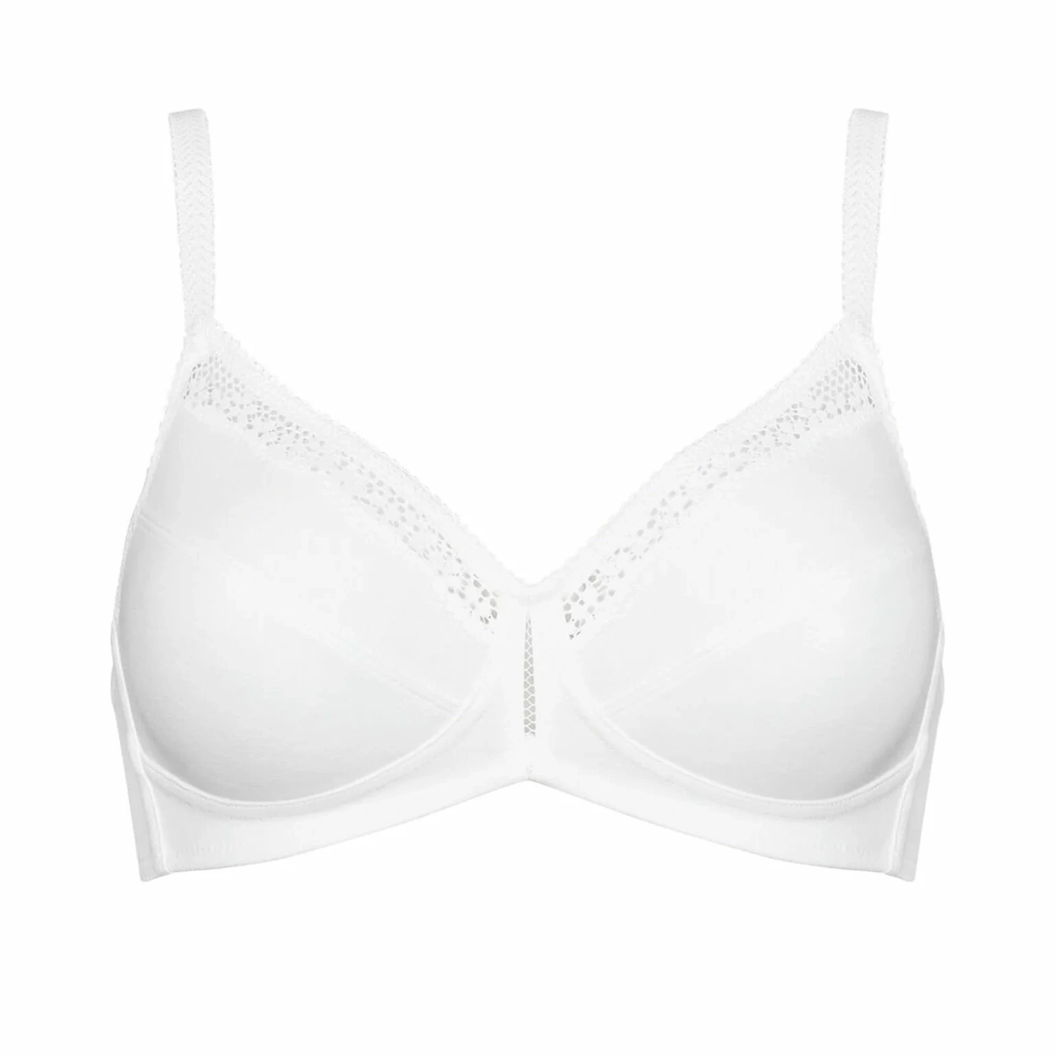 Navyztužená podprsenka bez kostíc z príjemného materiálu, vo výstrihu zdobené košíčky všitou jemnou čipkou.