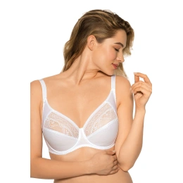 Mäkká dámska podprsenka. Košíčky sú vyrobené z čipky s geometrickými vzormi. Dizajn a strih modelu d