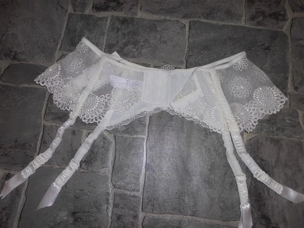 Čipkový podväzkový pás s kvetinovým motívom. Popruhy na pančuchách majú reguláciu. Okraje čipky sú u