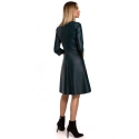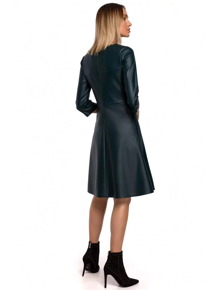 Minimalizmus s nádychom extravagancie - tieto klasické šaty áčkového strihu sú vyrobené z matnej umelej kože. DETAILY PRODUKTU: skater šaty z umelej kože s ozdobným prešívaním dĺžka nad kolená trojštvrťové rukávy skrytý zips vzadu podšité Naša modelka je vysoká 171 cm a nosí veľkosť S