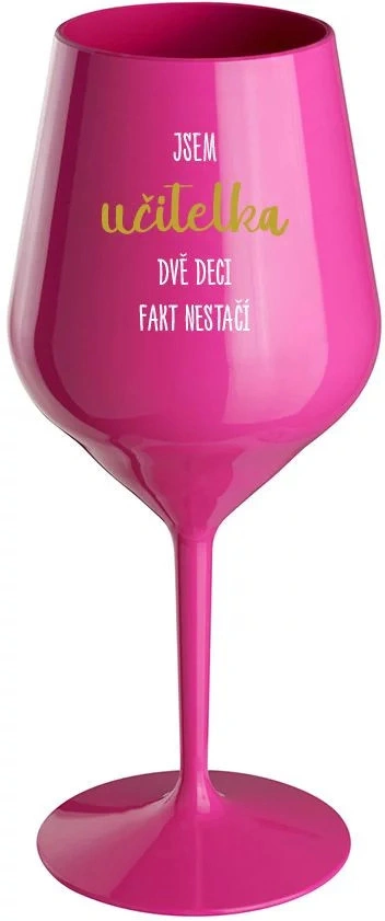 Nerozbitný ružový pohár na víno s motívom I AM A TEACHER, TWO DECI FACTS ARE NOT ENOUGH je skvelý na záhradu, pláž, výlet, piknik a poslúži aj pri kempovaní. Keďže je vyrobený z kvalitného polykarbonátu, je de facto nerozbitný. Je to luxusný kúsok, s ktorým si víno vychutnáte takmer kdekoľvek. Má ergonomický tvar, ktorý pekne padne do ruky, a keďže je ľahký, uľahčuje prenášanie. Ľahko sa skladuje a ľahko sa čistí. Vďaka jeho dizajnu si s ním môžete vychutnať bezproblémové pitie výborného vína naozaj kdekoľvek.