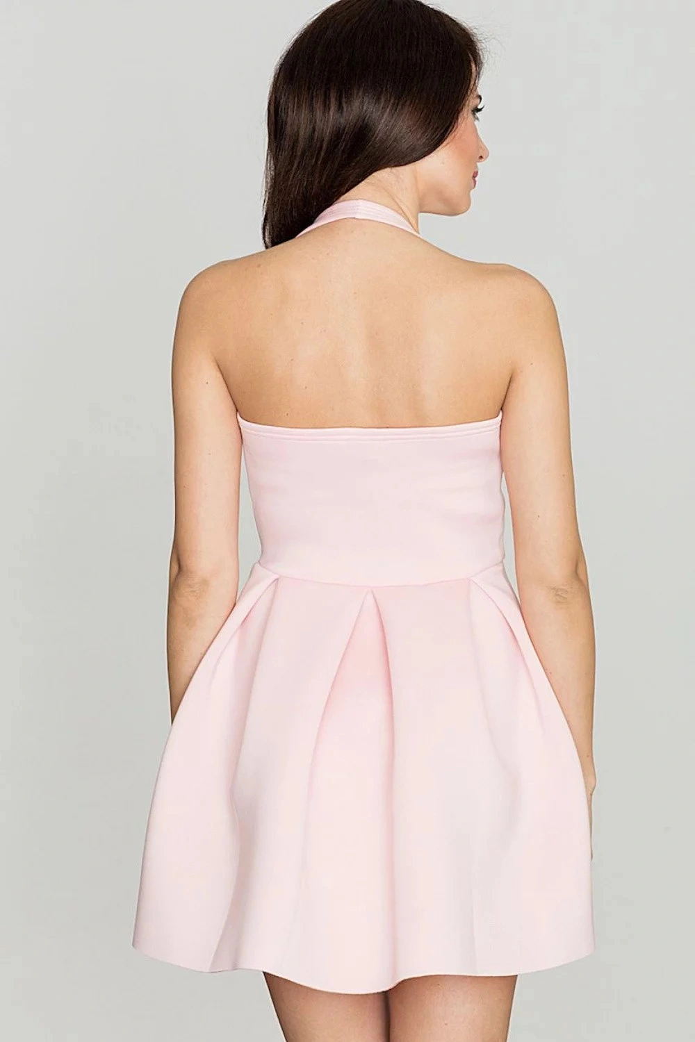 Krásne penové šaty bez chrbta, vypasované za krkom, asymetrický predný diel so zapínaním na gombíky, sukne s protiľahlým skladaním.