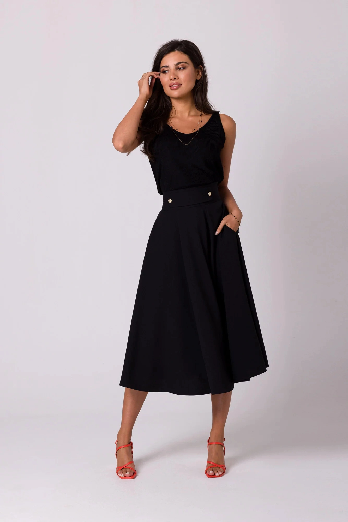 Táto sukňa je veľmi ženská vďaka vysokému pásu, rozšírenému vzoru a ozdobným zlatým gombíkom vpredu.