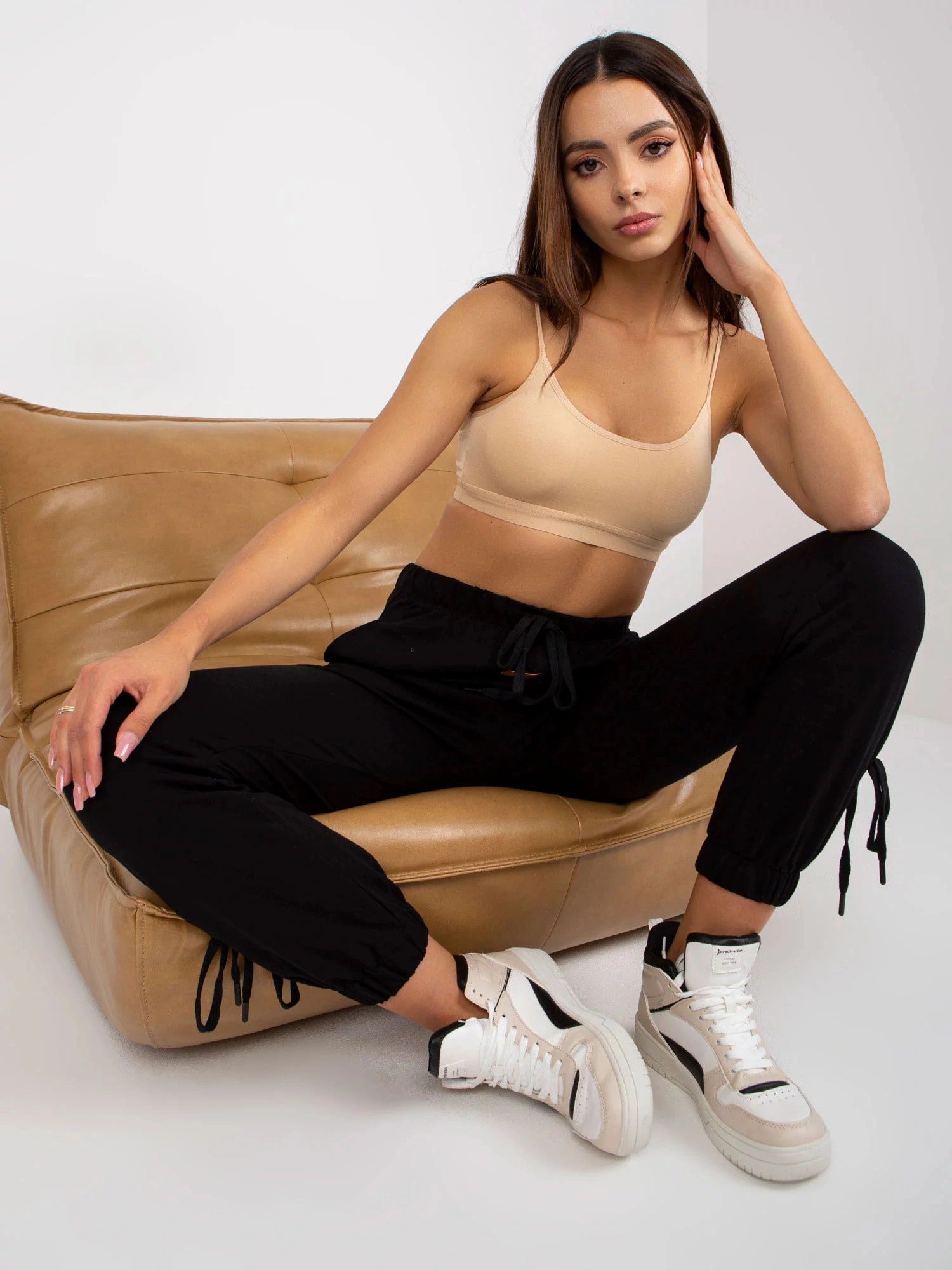 Modelka má na sebe veľkosť S. Rozmery modelky: výška 175 cm, prsia 84 cm, pás 61 cm, boky 91 cm.