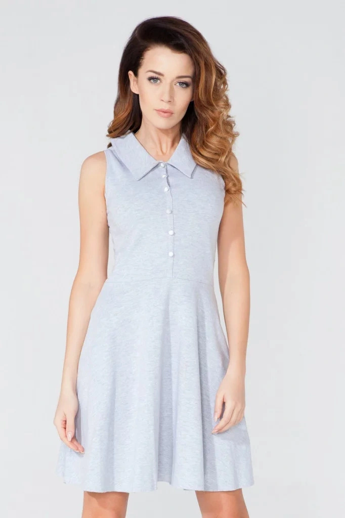 Šedé trapézové midi šaty s dlhými bufetovými rukávmi zakončenými riasením, bez podšívky, bez vreciek