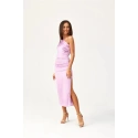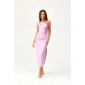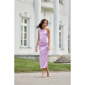 Tieto midi šaty na jedno rameno s jemným rozparkom na nohách sú vyrobené z mäkkej saténovej tkaniny. Na boku je riasenie, ktoré dokonale zakryje všetky nedokonalosti. Široký pásik s riasením na jednom ramene im dodáva jedinečný charakter. Zapínajú sa na krytý zips na boku šiat. Tieto midi šaty sú nielen elegantné, ale aj funkčné. Dĺžka midi dodáva šatám sofistikovaný, ženský štýl. Vďaka tomuto strihu šiat sa budete cítiť originálne tým, že zdôrazníte svoj osobitý štýl a určite upútate pozornosť tým, že sa odlíšite od davu bez ohľadu na príležitosť. Výrobok je vyrobený a ušitý v Poľsku.