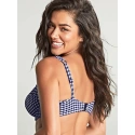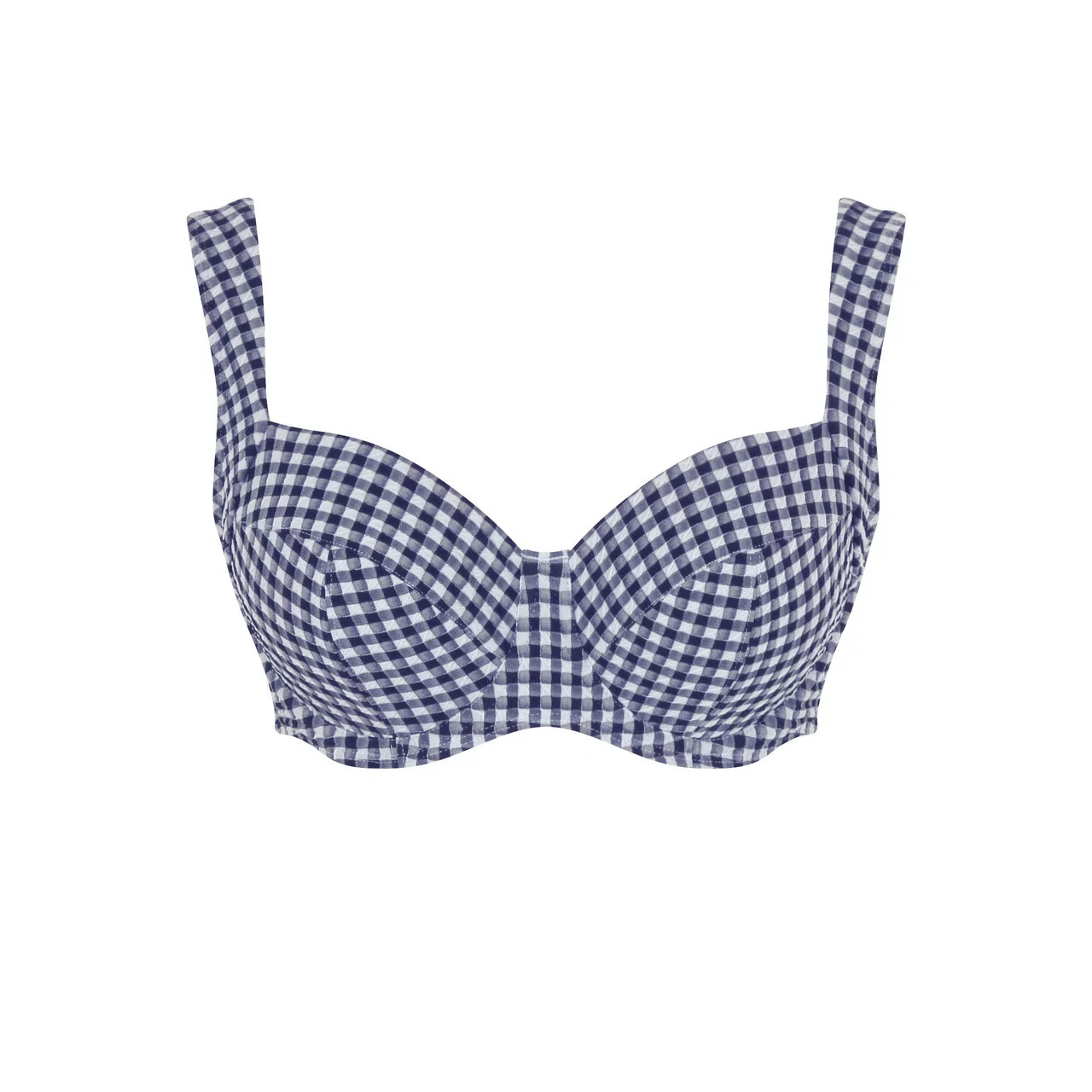 Drôtený vrchný diel bikín s plnými košíčkamiPriliehavé predné ramienka pre pohodlné nosenie na ramenáchPoskytuje pohodlné a podporné nosenie až do veľkosti košíčkov K (US O)Vyrobené z luxusnej textúrovanej ginghamovej tkaniny v námorníckej a bielej farbeSpárujte s nohavičkami Gingham Midi Gathered Bikini Bottoms pre sofistikovaný vzhľad pri bazéne
