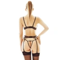 - ušitý zo zvodnej čipky - mäkká podprsenka s kosticou - nastaviteľné ramienka - elastické pásiky - šnúrkové tangá - vysoký podväzkový pás
