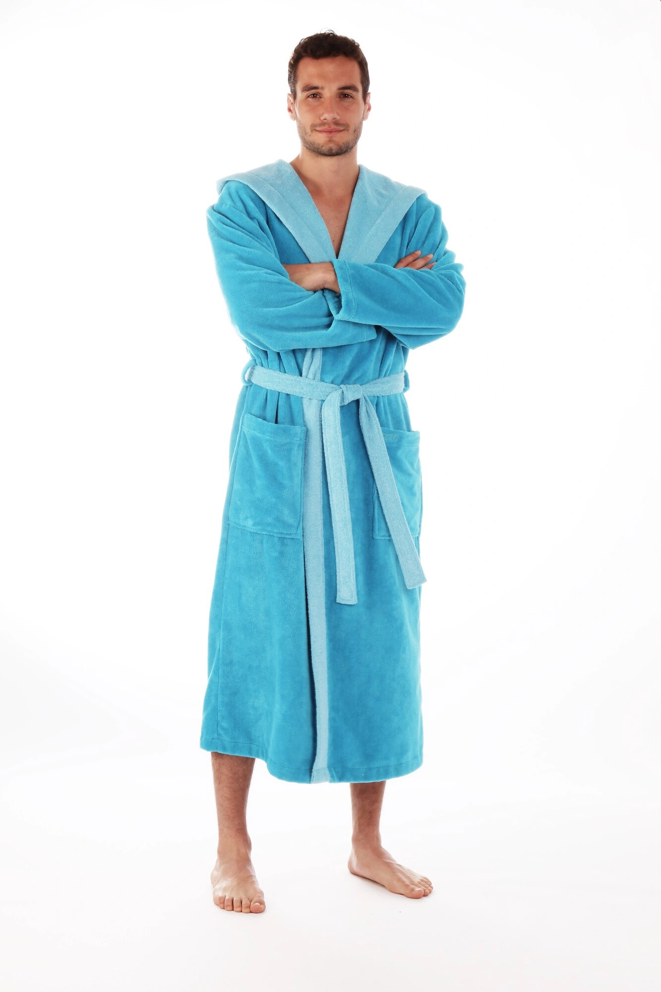 Pánsky župan s golierom. Župan má zaväzovanie v páse a vrecká na bokoch. Zloženie: 79 % bavlna, 17 %